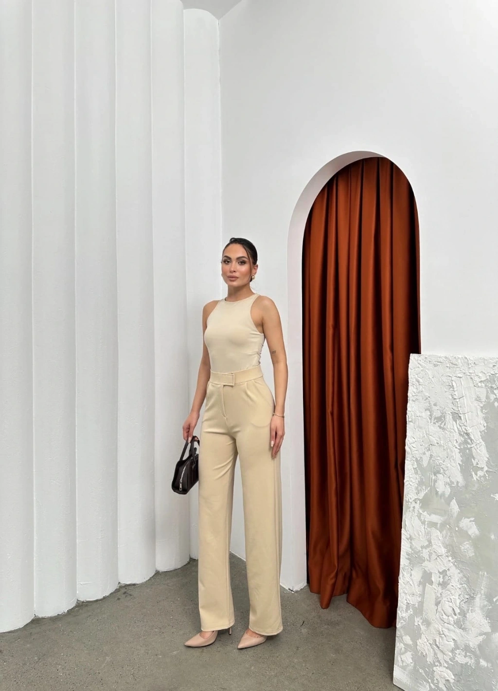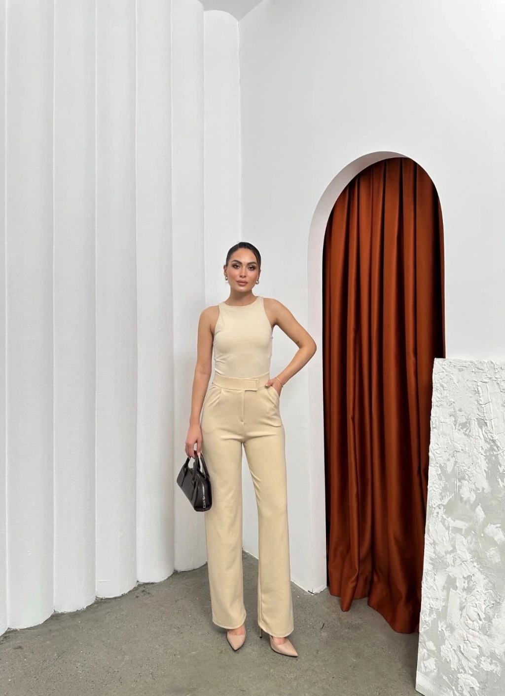 Şık ve rahat tasarımıyla dikkat çeken Krep Bej Cırtlı Pantolon, gardırobunuzun vazgeçilmez parçası olmaya aday!