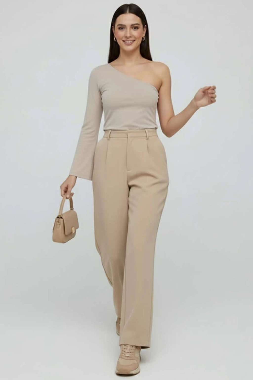 Şıklığı ve rahatlığı bir arada arayanların tercihi Tek Omuzlu Basic Bluz Vizon T4275, şimdi sizi bekliyor!