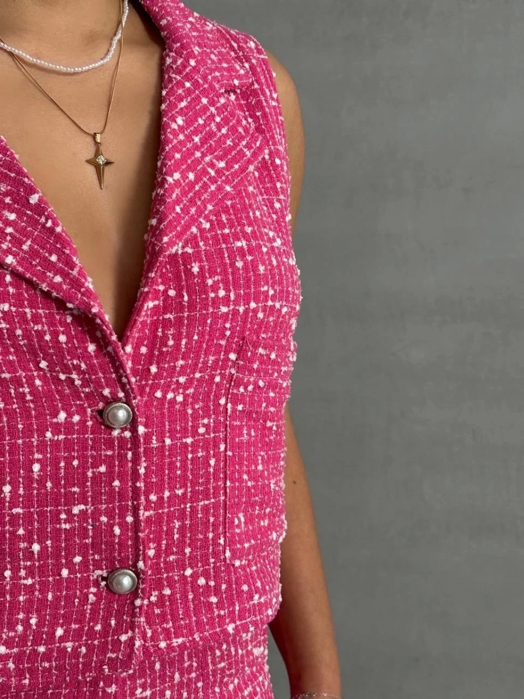 - Pembe renkli yeleğiyle dikkat çeken şort takım, yaz aylarının vazgeçilmezi olacak.