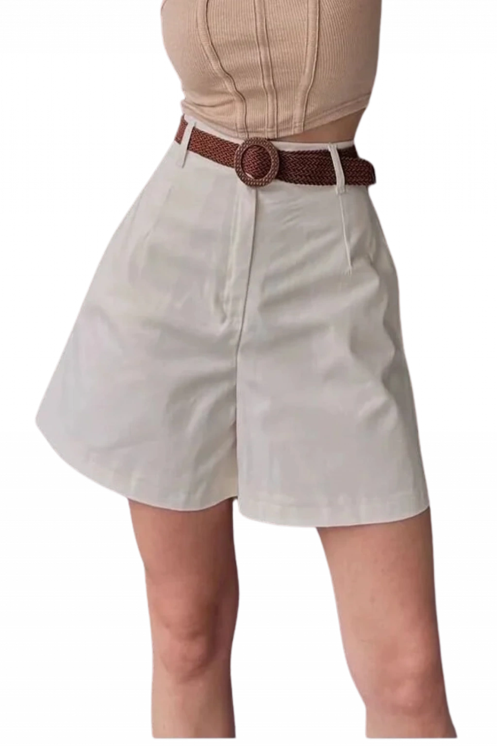 Rahat Kesim Kemerli Mom Şort - KREM